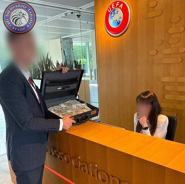 在裁决公布前,水晶宫球迷持续发声抗议。最新行动中,忠实球迷组织“霍姆斯代尔狂热派”成员携装满假钞的行李箱,来到欧足联豪华的湖畔总部。这场行为艺术旨在讽刺他们认为欧足联更受金钱驱动而非公平,随行李箱附有致欧足联主席切费林的信件,要求撤销决定。