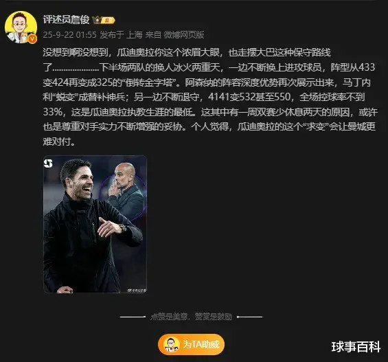 对于瓜帅在本场比赛做出的战术选择,詹俊老师赛后在社媒做出点评,可谓是一针见血。