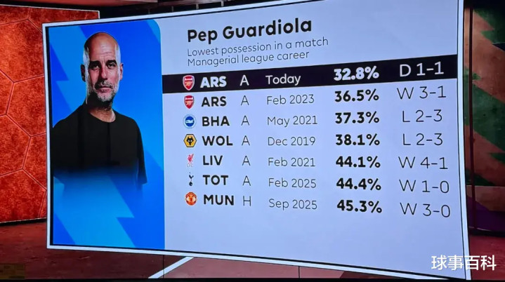 第76分钟,瓜帅撤下哈兰德,换上防守型中场尼科·冈萨雷斯,阵型变成5-5-0——活脱脱一份穆里尼奥式作业。 全场曼城控球仅32.8%,这是瓜帅执教601场联赛以来的最低值。