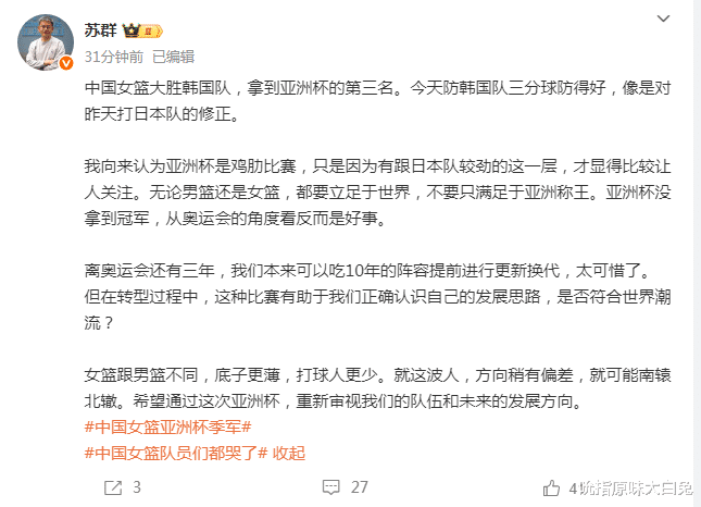 苏群发文谈到了中国女篮,他说这次防韩国女篮的三分,更像是对日本队的修正。亚洲杯没拿到冠军,从奥运会的角度看反而是好事。本来可以吃10年的阵容,提前进行更新换代。在奥运会上,日本是亚洲队伍,虽然很强,但是到奥运会上不会给我们分在一个小组。要在小组出线,附加赛淘汰对手,主要对手来自欧洲和非洲。按照现在奥运会资格的选拔,确实没必要特别关注亚洲杯,在世界杯上的成绩是关键,要争取在世界杯上,拿到亚洲最好的成绩。