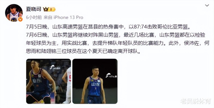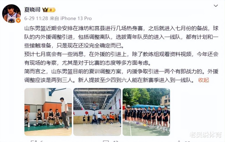 前几天已经打完两场热身赛,分别是85-75战胜埃及男篮;76-78输给美国加州天才男篮。这三场比赛,主教练邱彪已经明牌,就是重点在锻炼年轻球员,尤其是考察小将,据夏晓司的消息,新赛季将会有5小将进入到一线队。他的消息还是非常准确的,因为夏晓司是山东体育频道著名的记者。