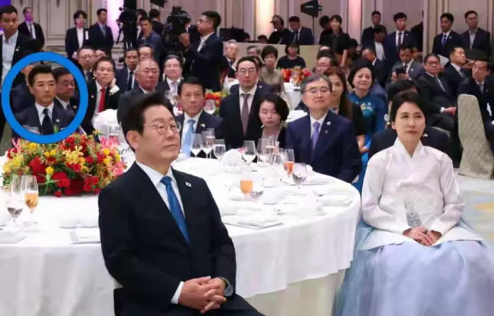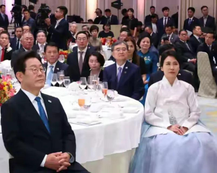 这次他受邀出席宴会,他待遇超高。跟李在明和金惠景同桌而坐,李在明一身黑色西装很是精神,而金女士一身传统韩服,浅白色上衣搭配蓝色裙子,优雅端庄,淡然宁静,她将头发盘起来了,整个人气质超绝。