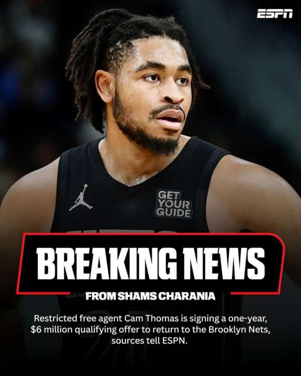 来自名记Shams的最新报道,受限制自由球员卡梅伦托马斯将与篮网签下一份1年600万美元的资质报价,这意味着他在新赛季将拥有交易否决权,同时可以在2026年成为完全自由球员。