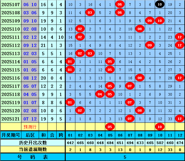 后区第二位推荐:在连续5期开奖中分别出号:07、05、07、08、12,均值为7.8,其中偶数奖号出现较少,本期适当关注偶数号码回补,参考号码10。