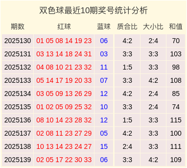 双色球2025139期开奖,本期奖号:红球02、05、17、22、30、33,蓝球06。其中红球奖号质合比为3:3,大小比为4:2,和值为109。