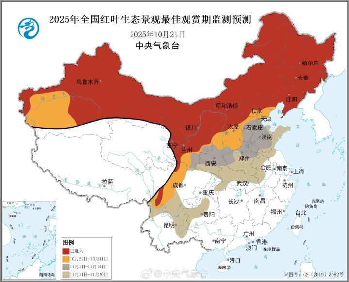 未来10天,新疆南疆西部、北京中南部、天津北部、河北中部、山西中南部、陕西中部、四川西北部等地将进入红叶最佳观赏期。