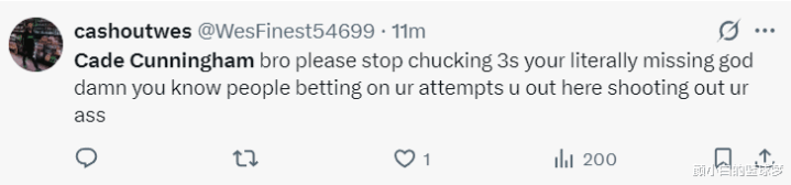 美球迷:坎宁安不要再瞎投三分了,简直是在浪费回合数,大家都在看你的投篮表现,都希望你能拿到至少20分,你简直是在辜负所有人的期待。