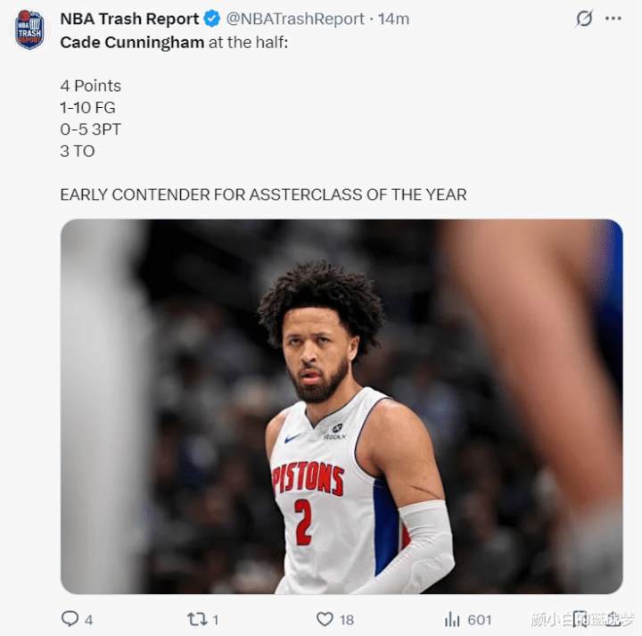 坎宁安作为活塞的第一超巨,首节3中1+三分1中0,次节7中0+三分4中0,上半场打了19分钟,10中1+三分。5中0+罚球2中2拿到4分2篮板3助攻3失误1盖帽,命中率10%,坎宁安打出了一场令人无奈的上半场