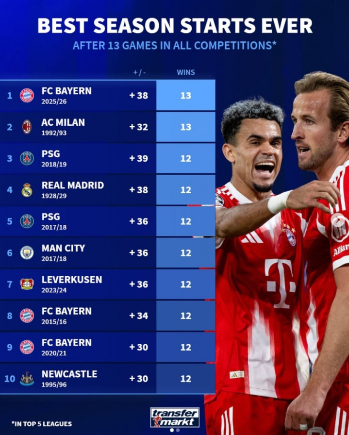 1.拜仁慕尼黑(2025/26赛季),+38净胜球,13胜
